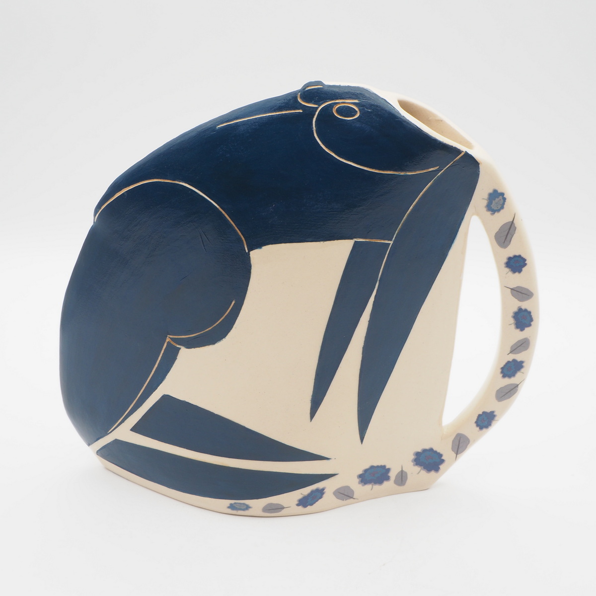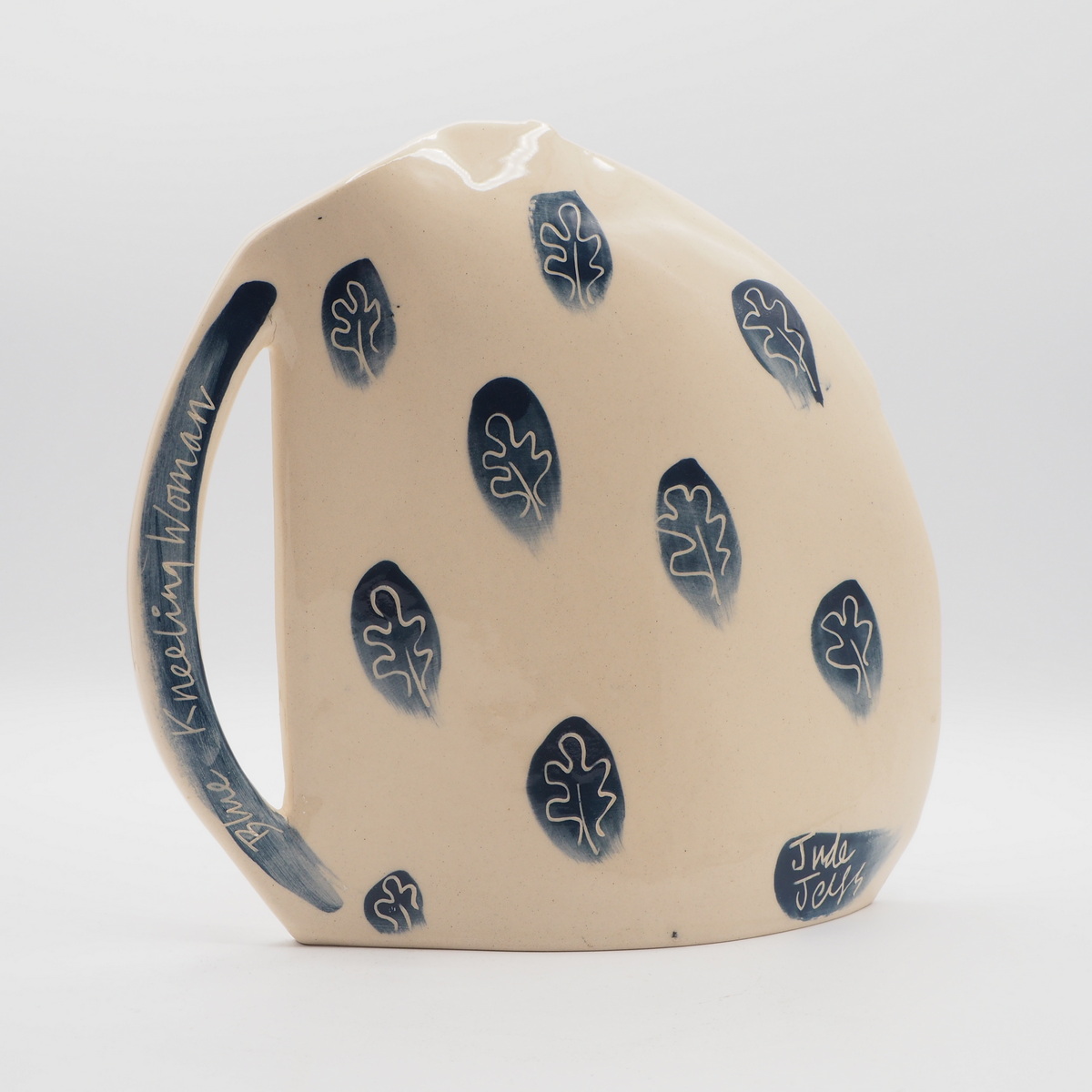 Signed Jude Jelfs vase with the title of the piece on the handle.