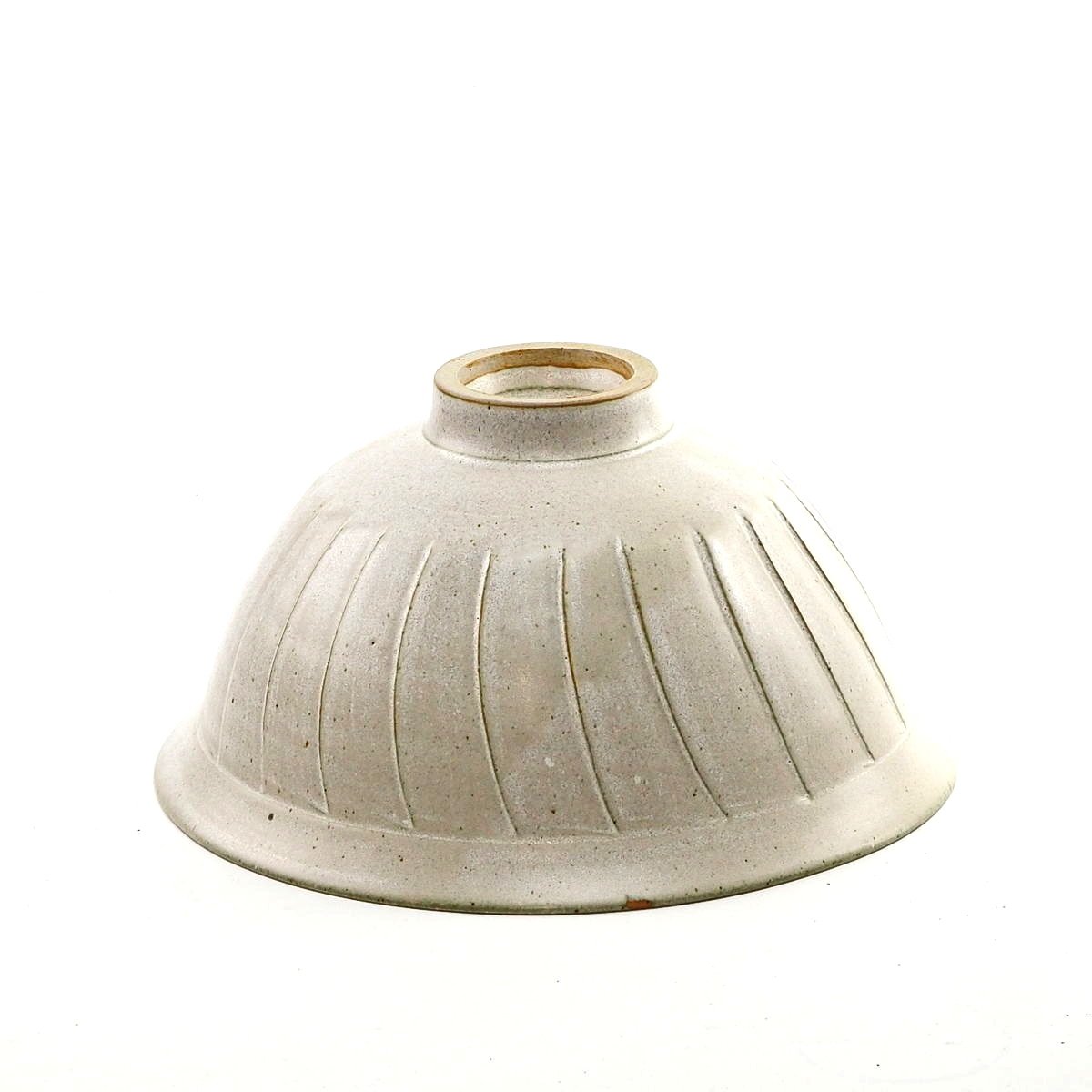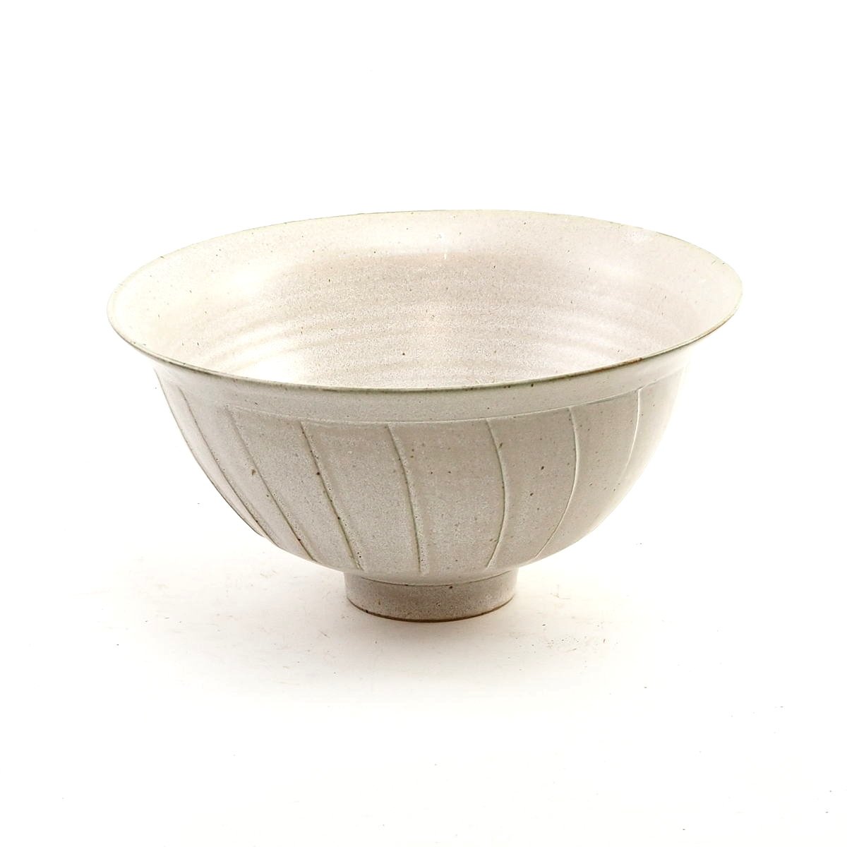 Stoneware fluted bowl. Matt white dolomite glaze with olive green speckle over body.