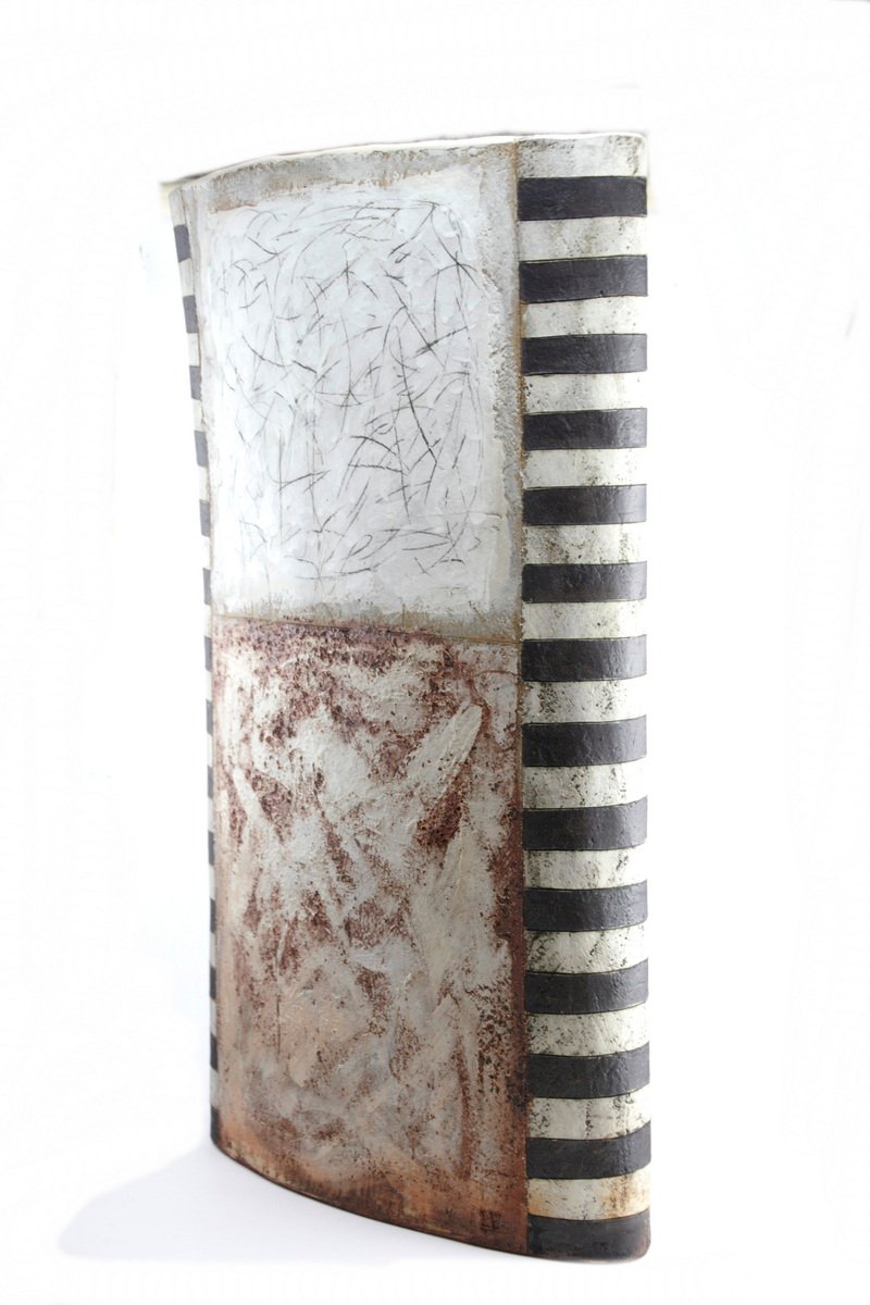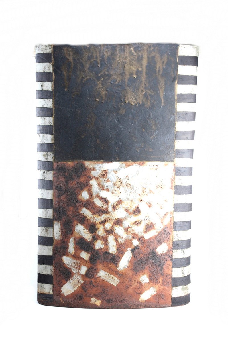 Stoneware, bands of black and white glaze to either side with central panels in burnt orange, white with black graphite drawing, mottled black and brushed red and brown.