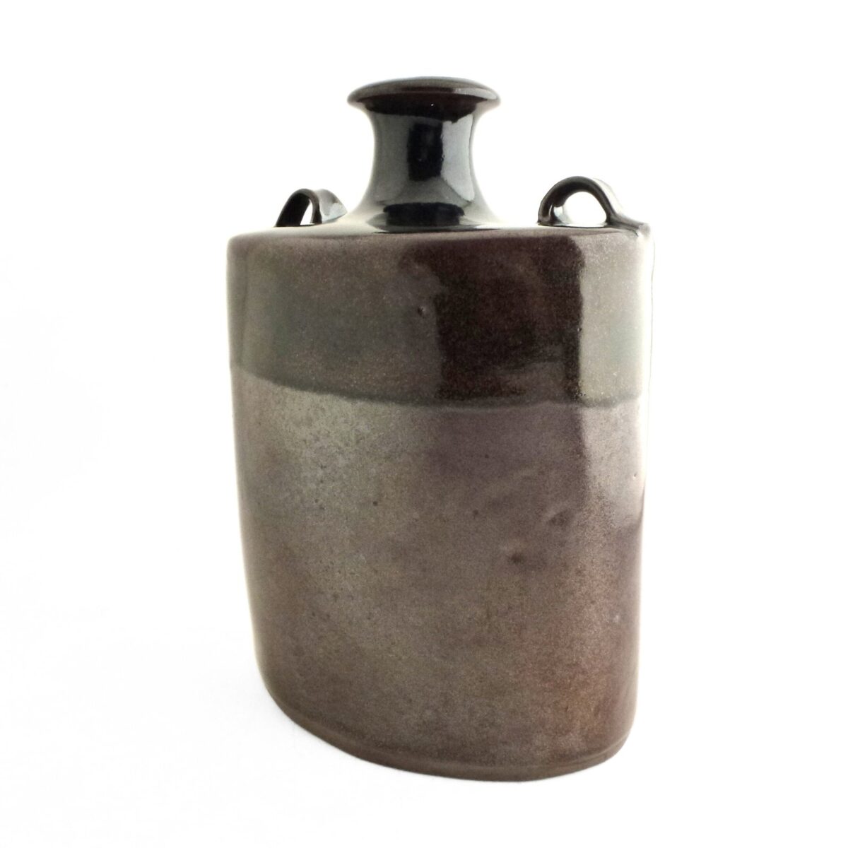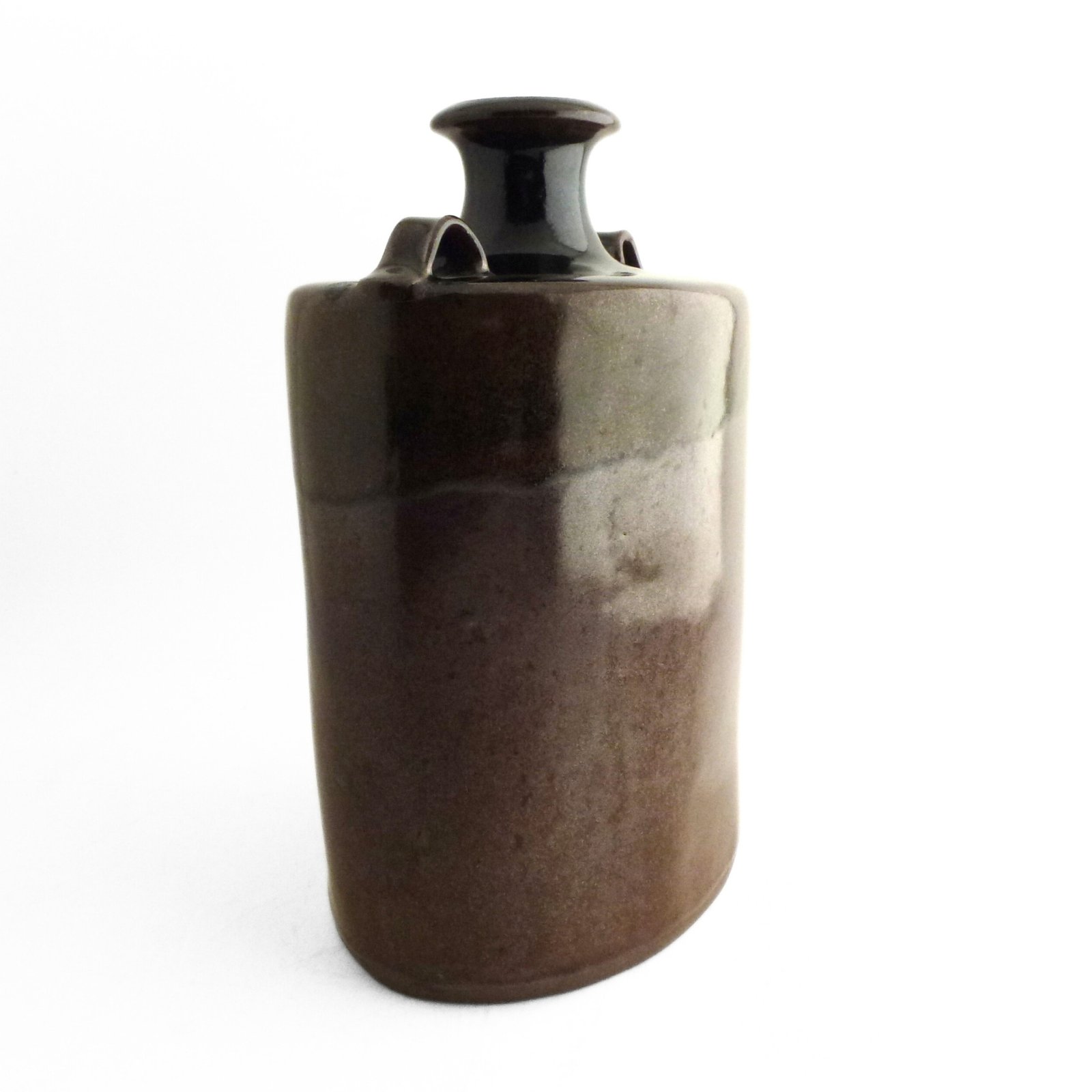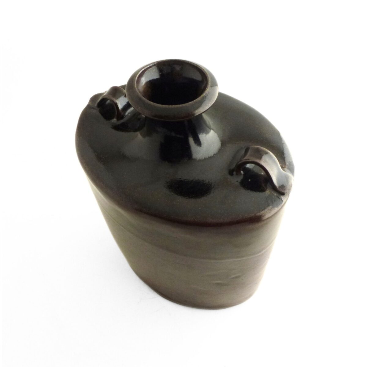 Large stoneware oval bottle vase with 2 handles to shoulders. One third tenmoku over iron-stone glaze