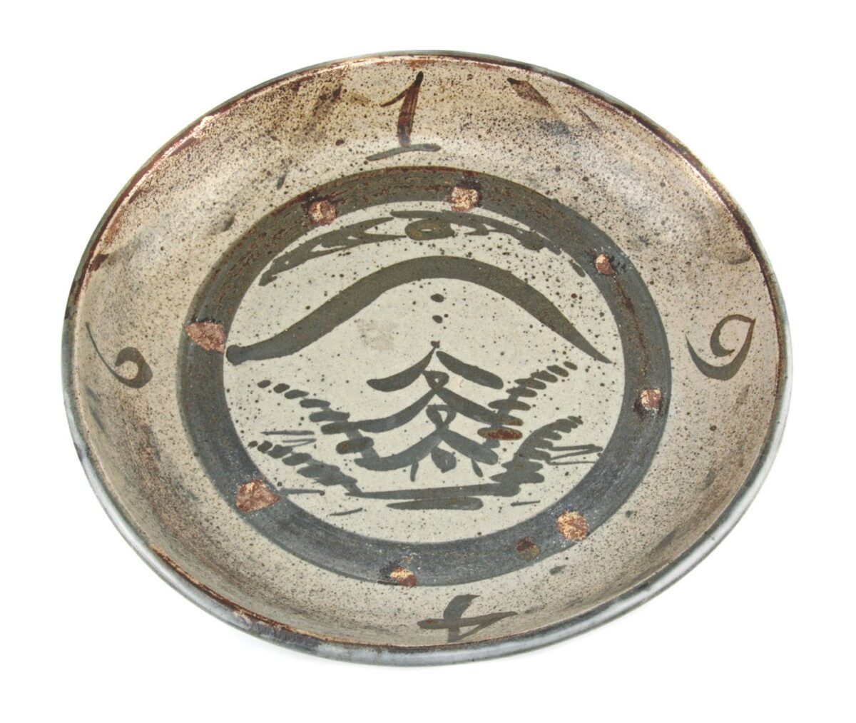 Large dish with painted pagoda design to well. Rim painted with the year 1946.