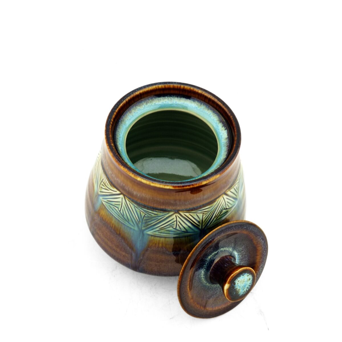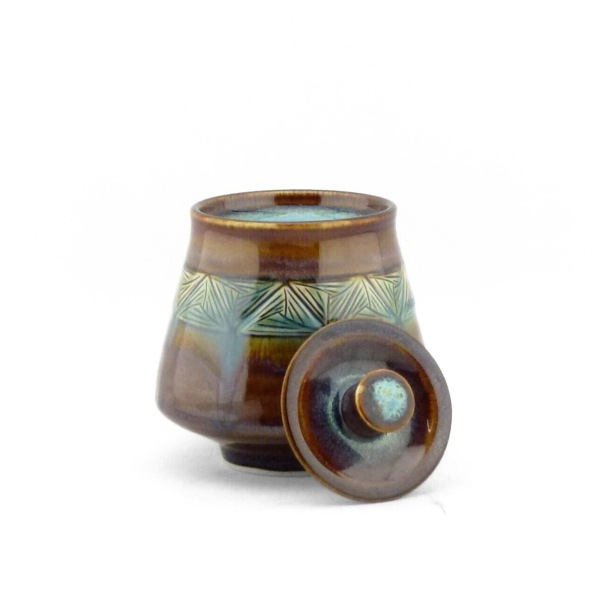 Stoneware lidded jar with incised triangle design.