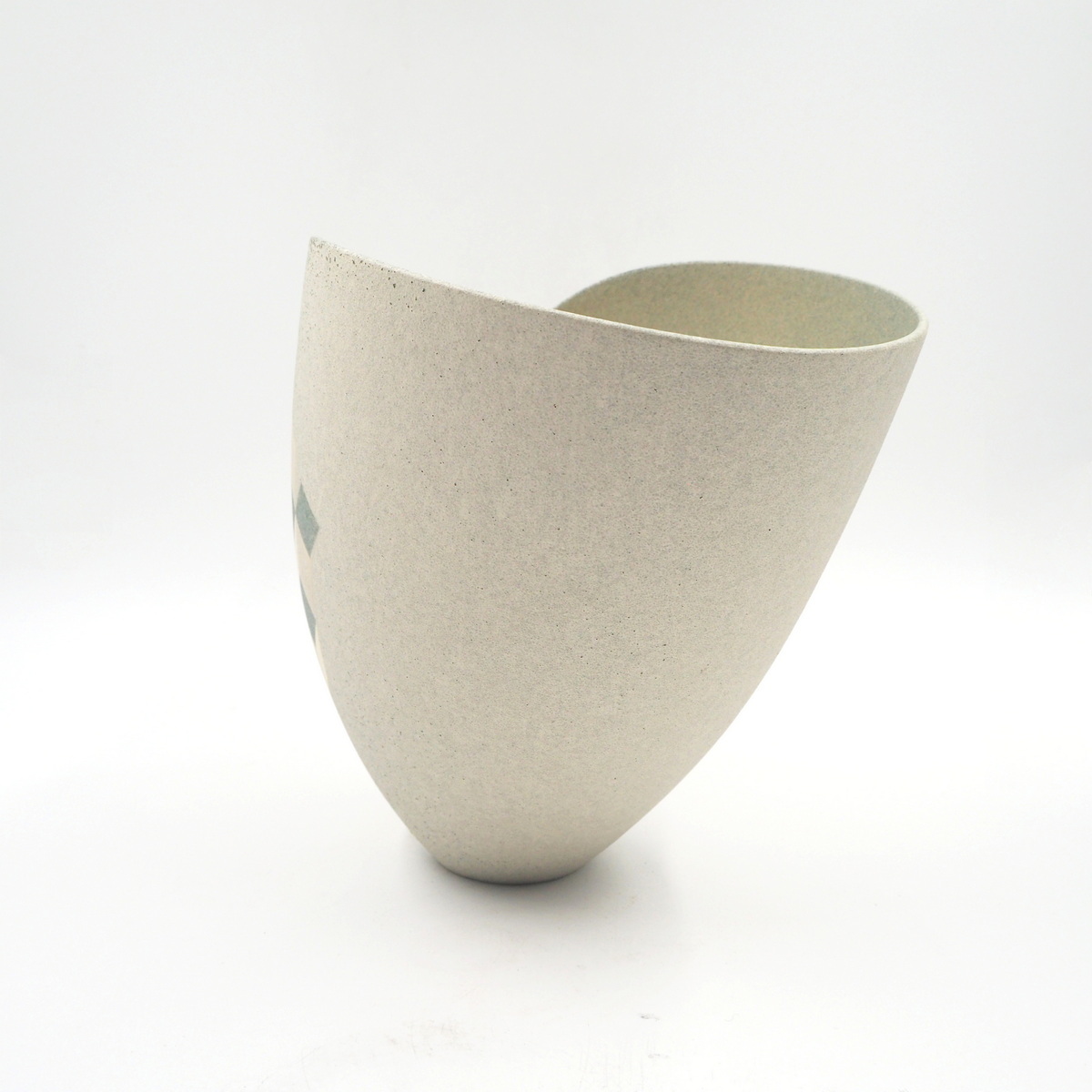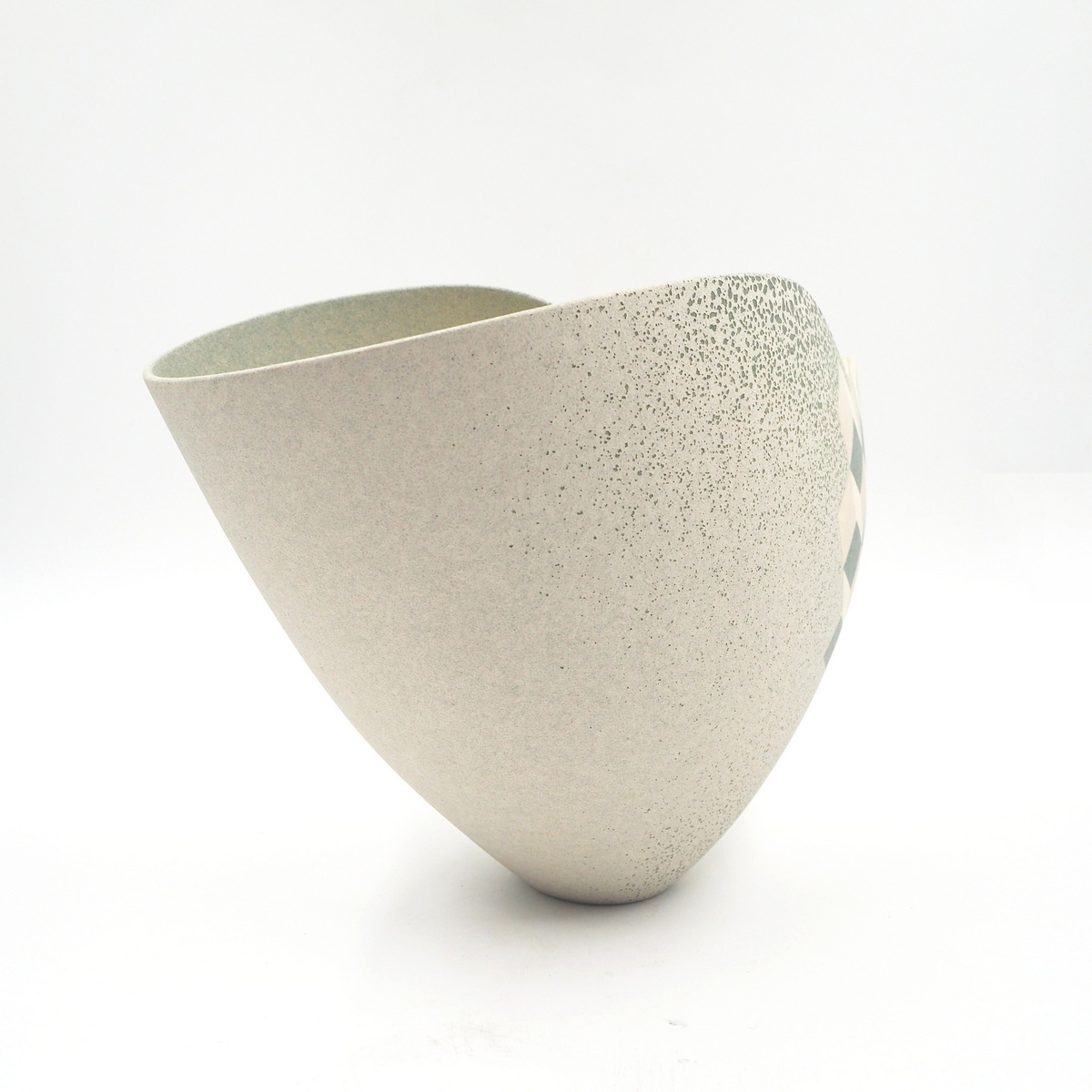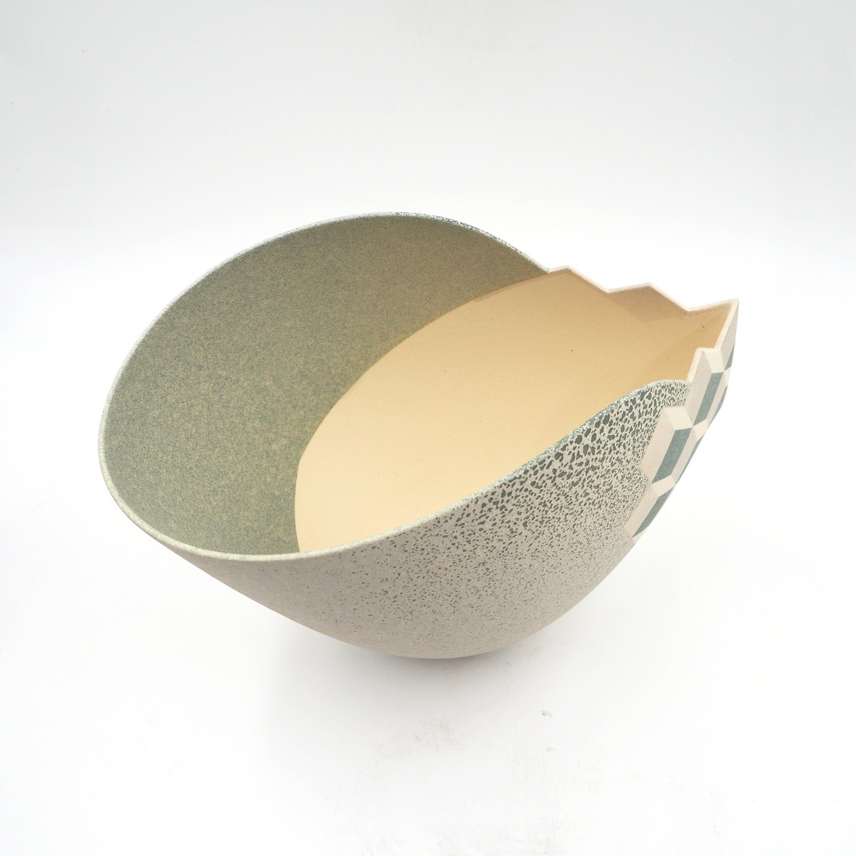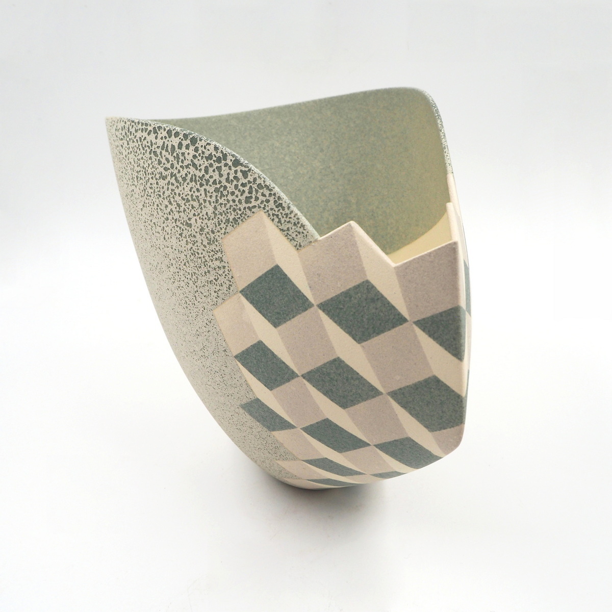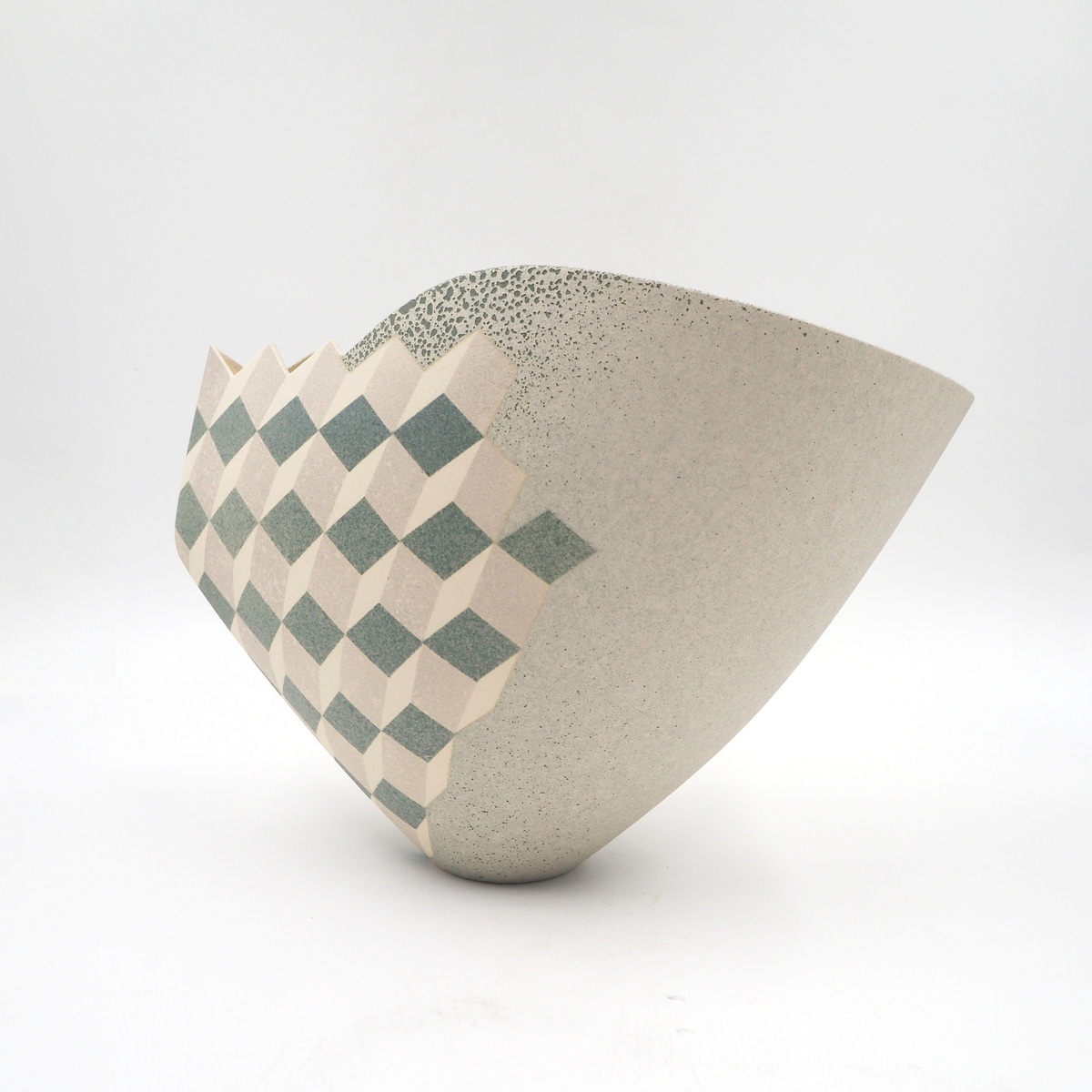 Stoneware, thrown and altered with geometric cube design. Multi-fired with masked and sprayed glazes, contrasting form and line, 1996.