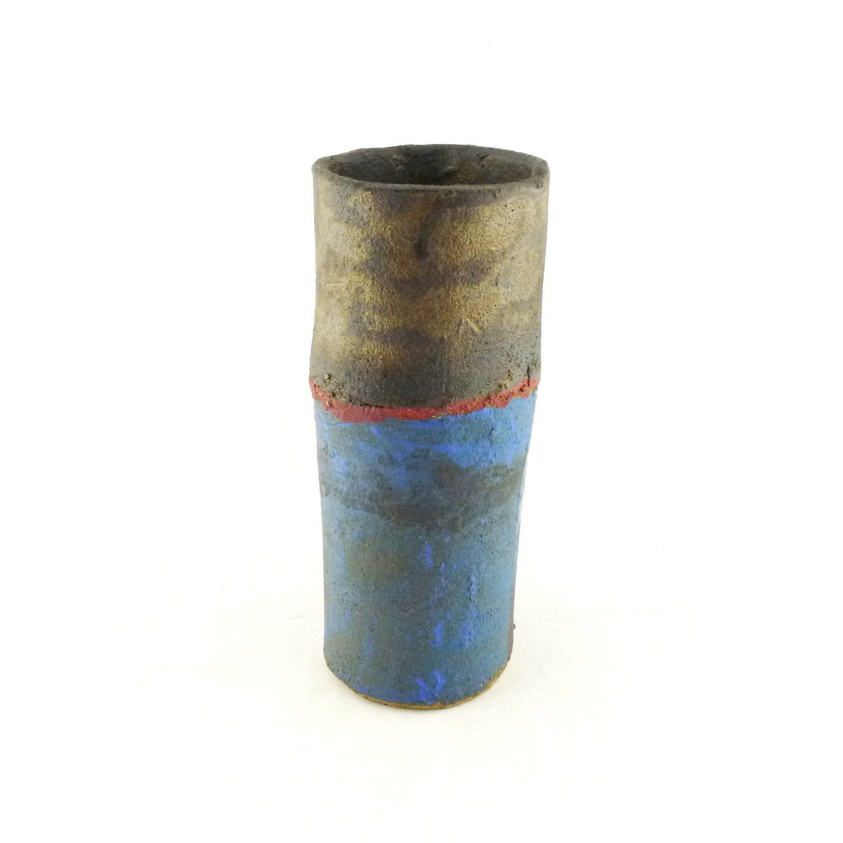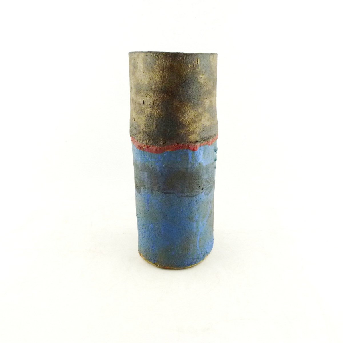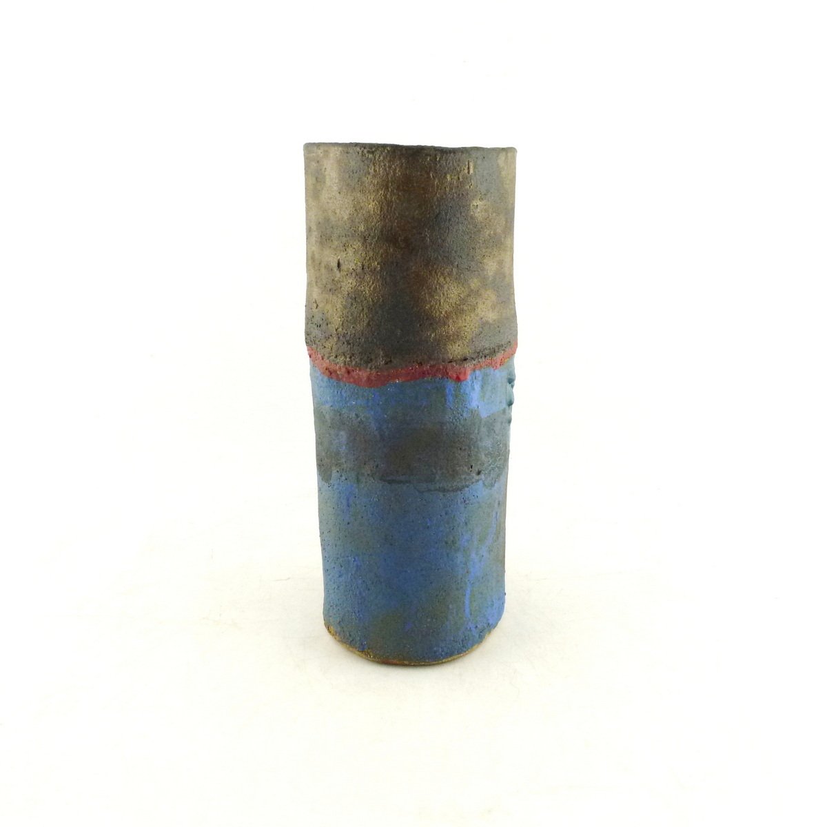 Stoneware ovoid vessel. Dry lustrous black, red and blue glazes over textured surface.
