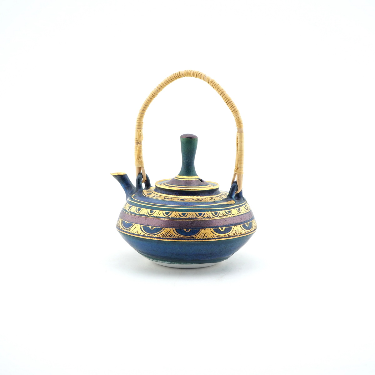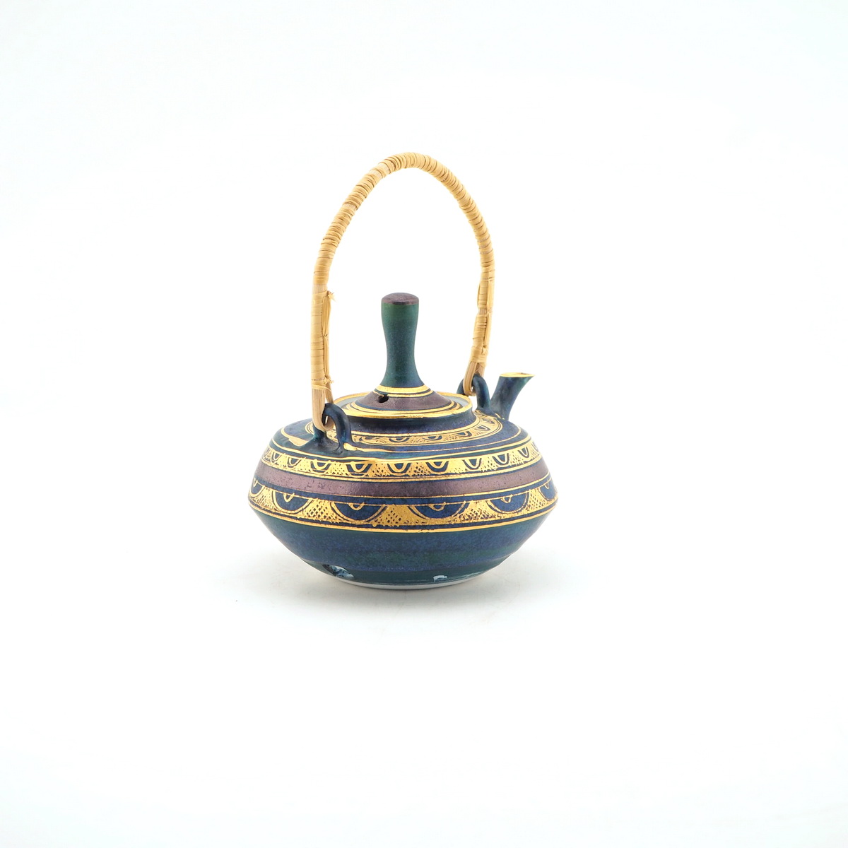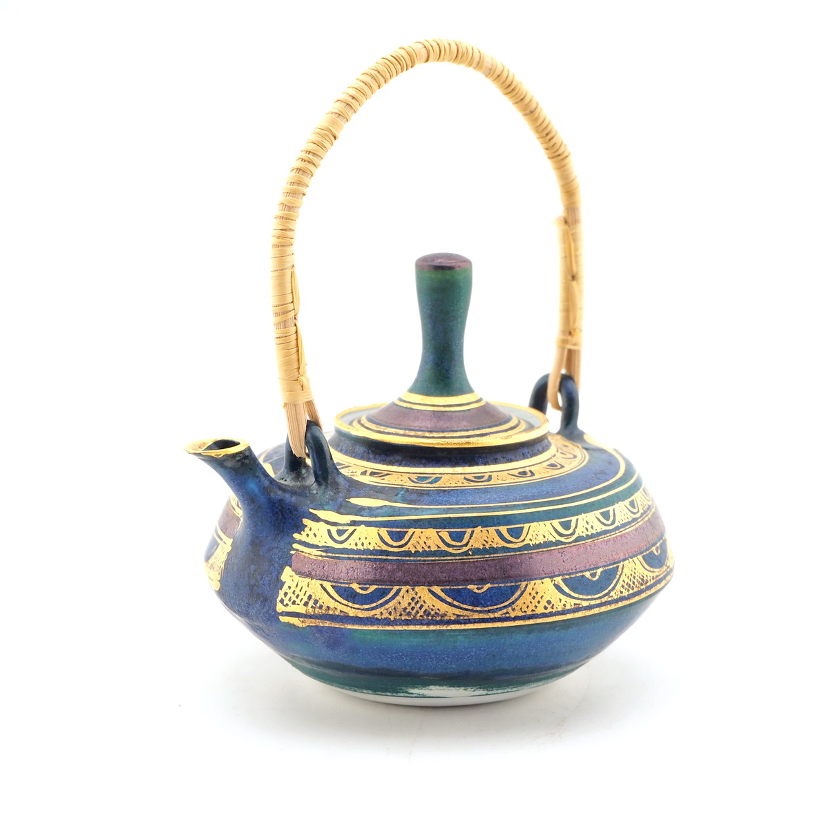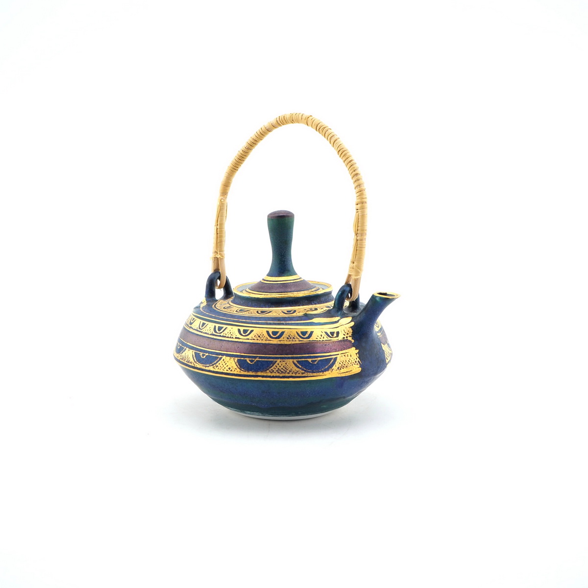 Lustrous porcelain teapot. Blue glaze with gold lustre hand painted decoration to body, with copper band to belly.