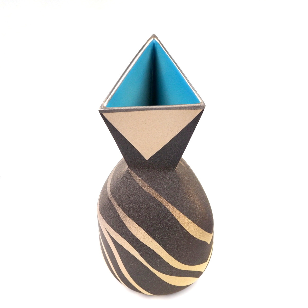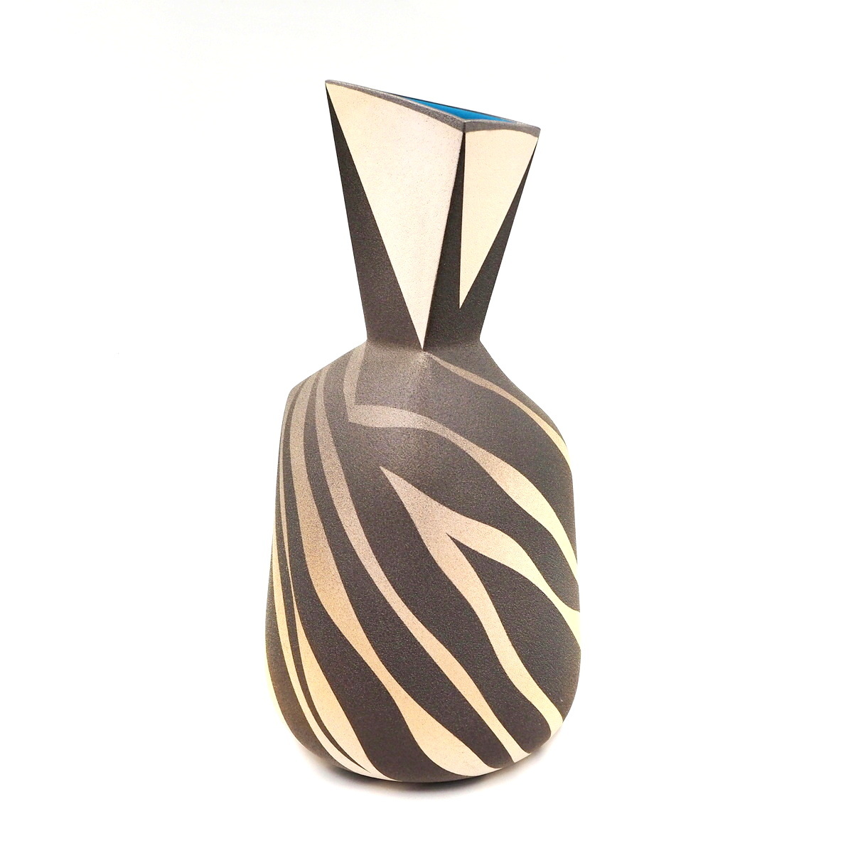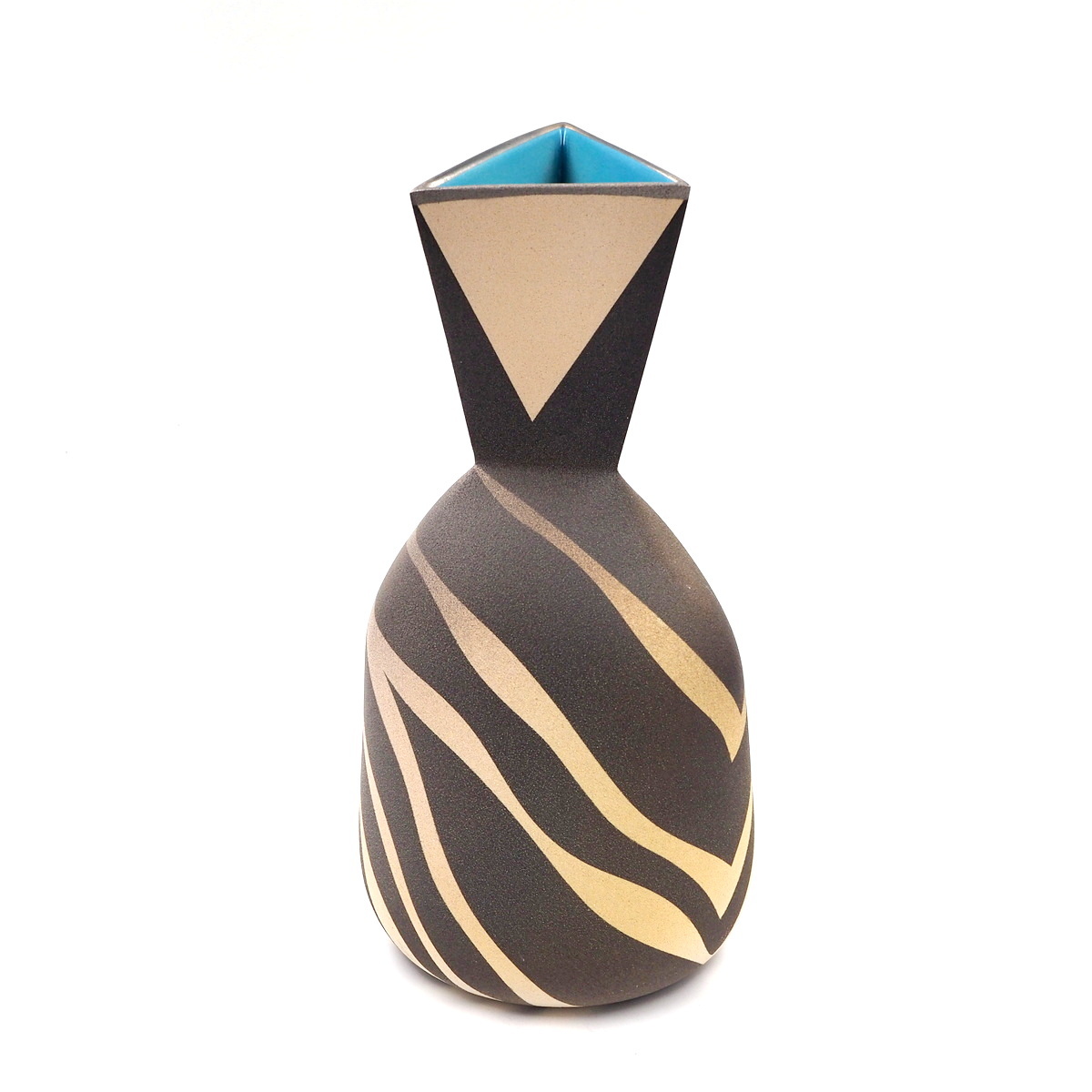 Stoneware vessel with tall tri-form neck on a rounded base. Thrown and altered with slab additions. Multi-glazed and fired with masked and sprayed glazes highlighting interactions between form and surface, c. 2011.