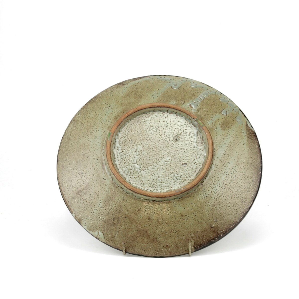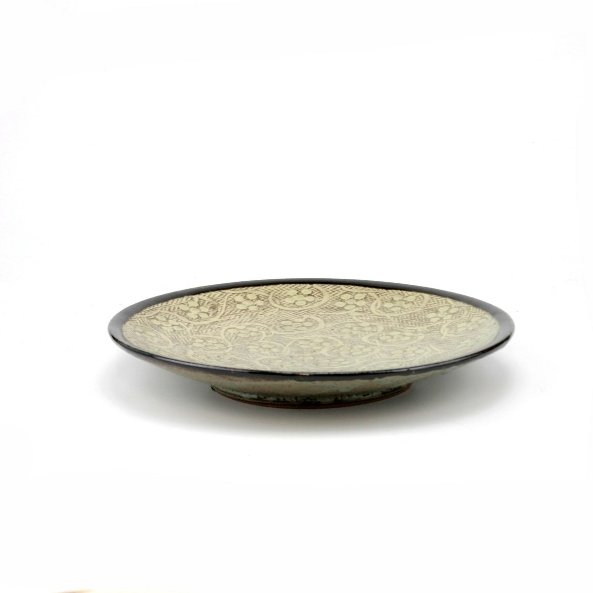 Stoneware dish with pale green ash glaze over a herringbone and foliate impressed cord design. Inlaid with white slip, rich tenmoku band to rim.