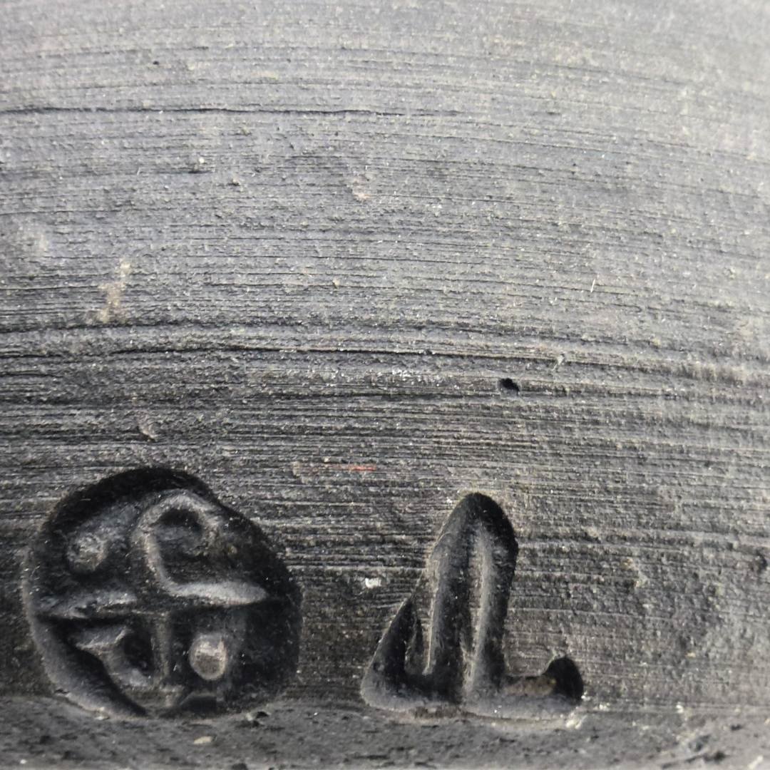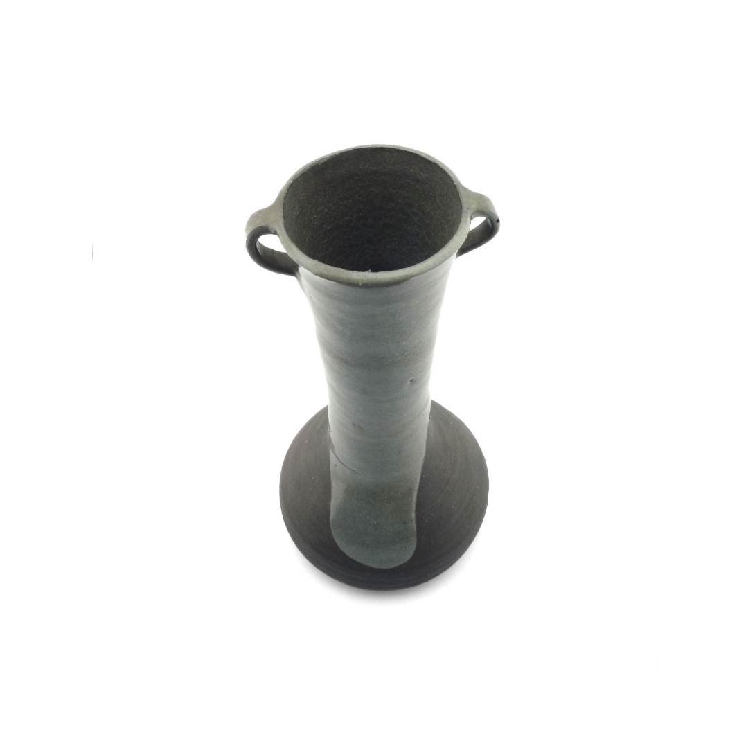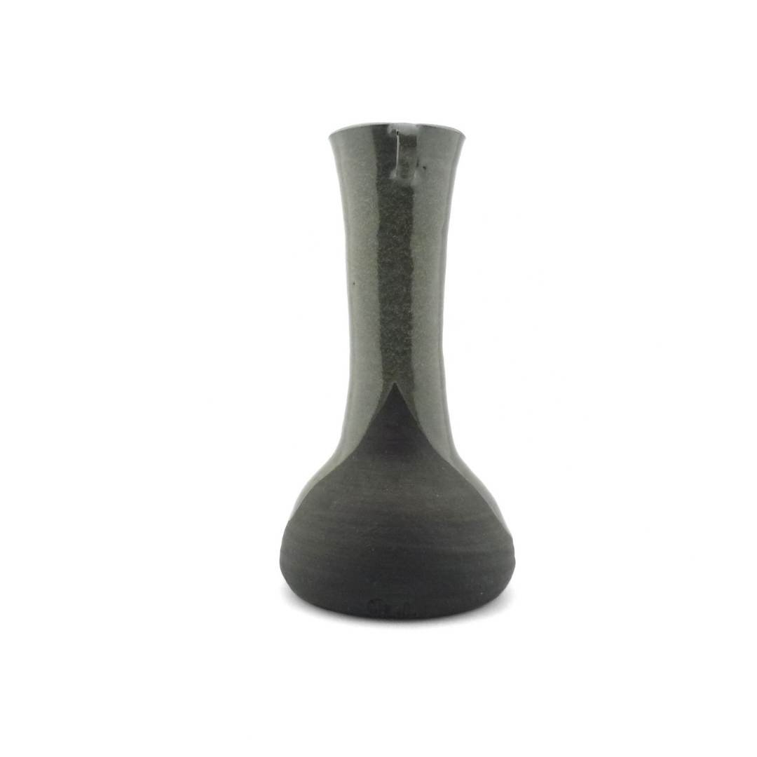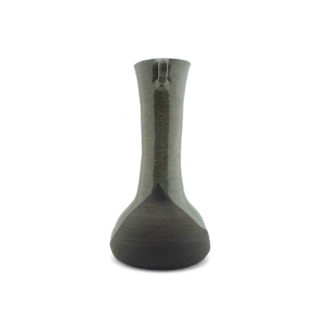 Stoneware, dry black body, moss green glazed running into two pours down the long slender neck and over the shoulders of the squat body, two small looping handles mounted at the rim.